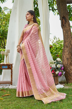 Baby Pink Colour Linen Cotton Saree With Zari Weaving Border
