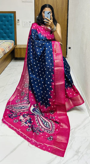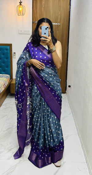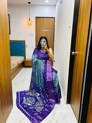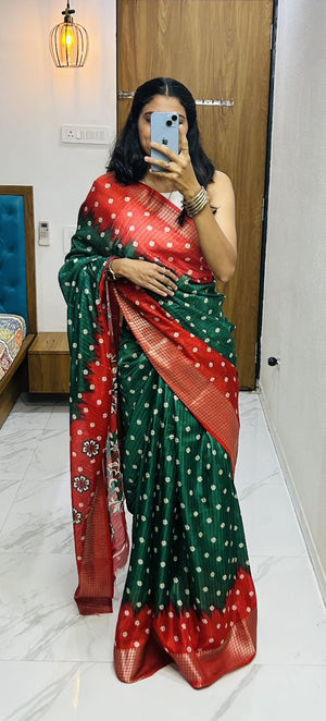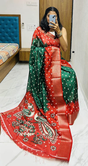Bandhej Printed Dola Silk Saree With Kalamkari Printed Pallu