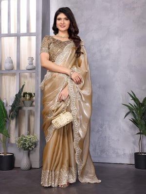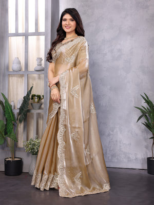 Beige Fancy Shimmer Chiffon Saree With Embroidery Work