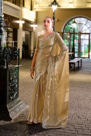 Beige Fancy Shimmer Chiffon Saree With Embroidery Work