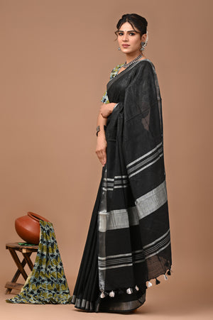 Black Colour Pure Plain Linen Cotton Saree With Ajrakh Blockprinted Cotton Blouse