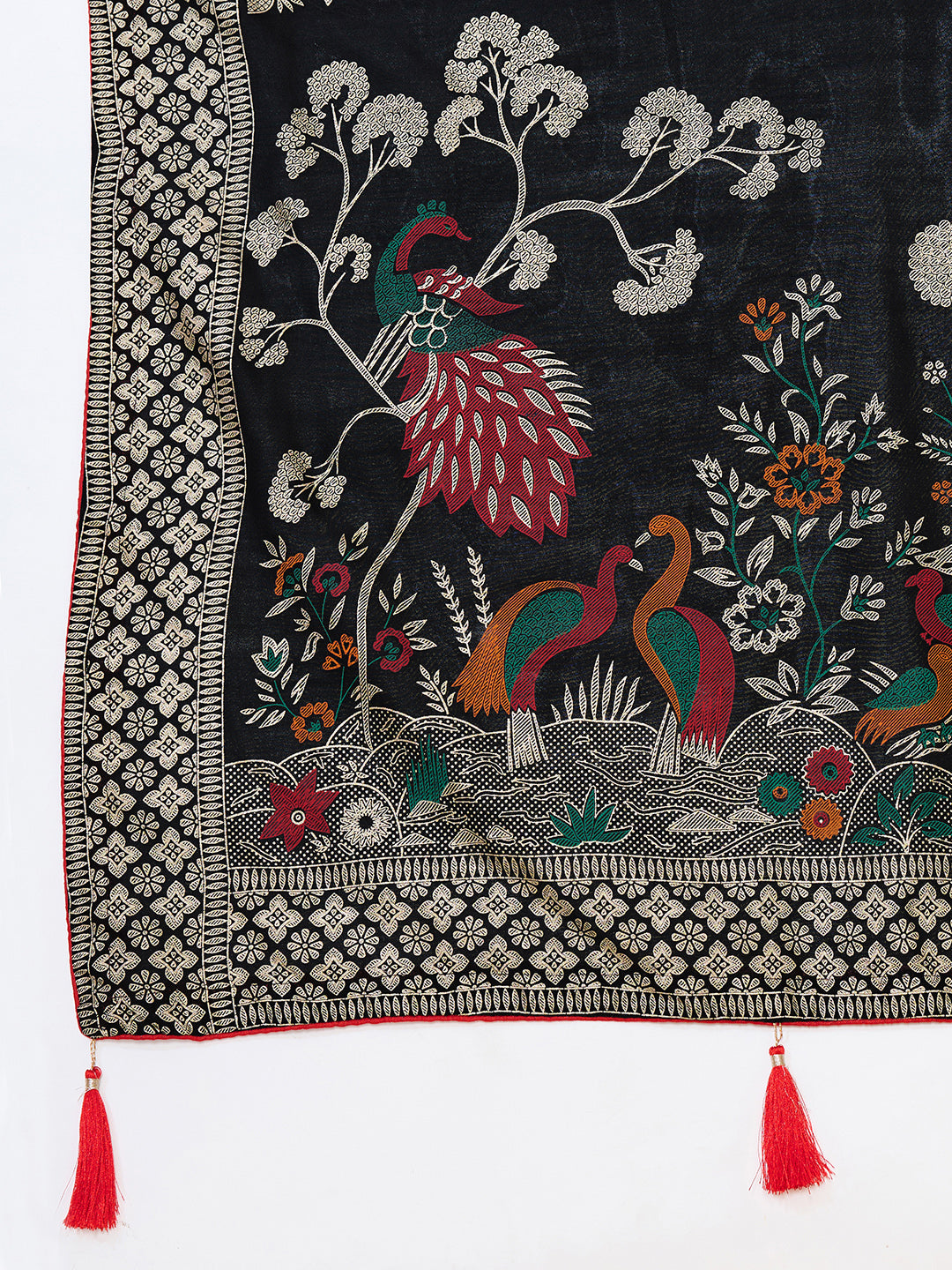 Black Cotton Saree With Table Printed And Foil Work With Pipeing Border