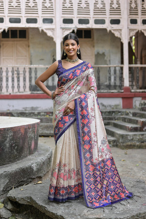 Blue Color Soft Tussar Silk Saree With Patola Printed Work