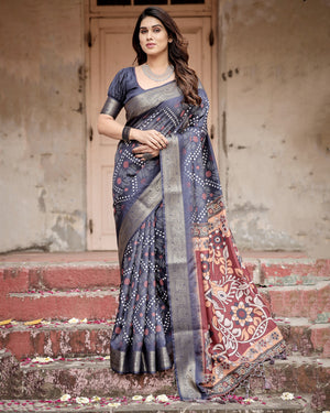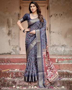 Blue Kalamkari Digital Printed Dola Silk Saree With Gold Zari Border