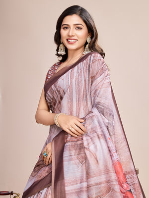 Brown Soft Linen Cotton Saree With Floral Printed Work