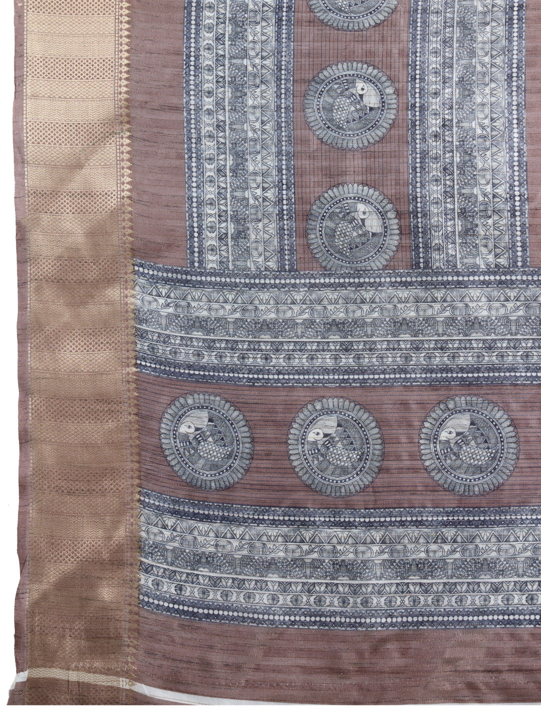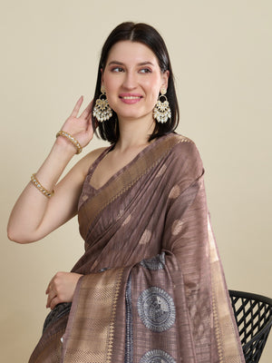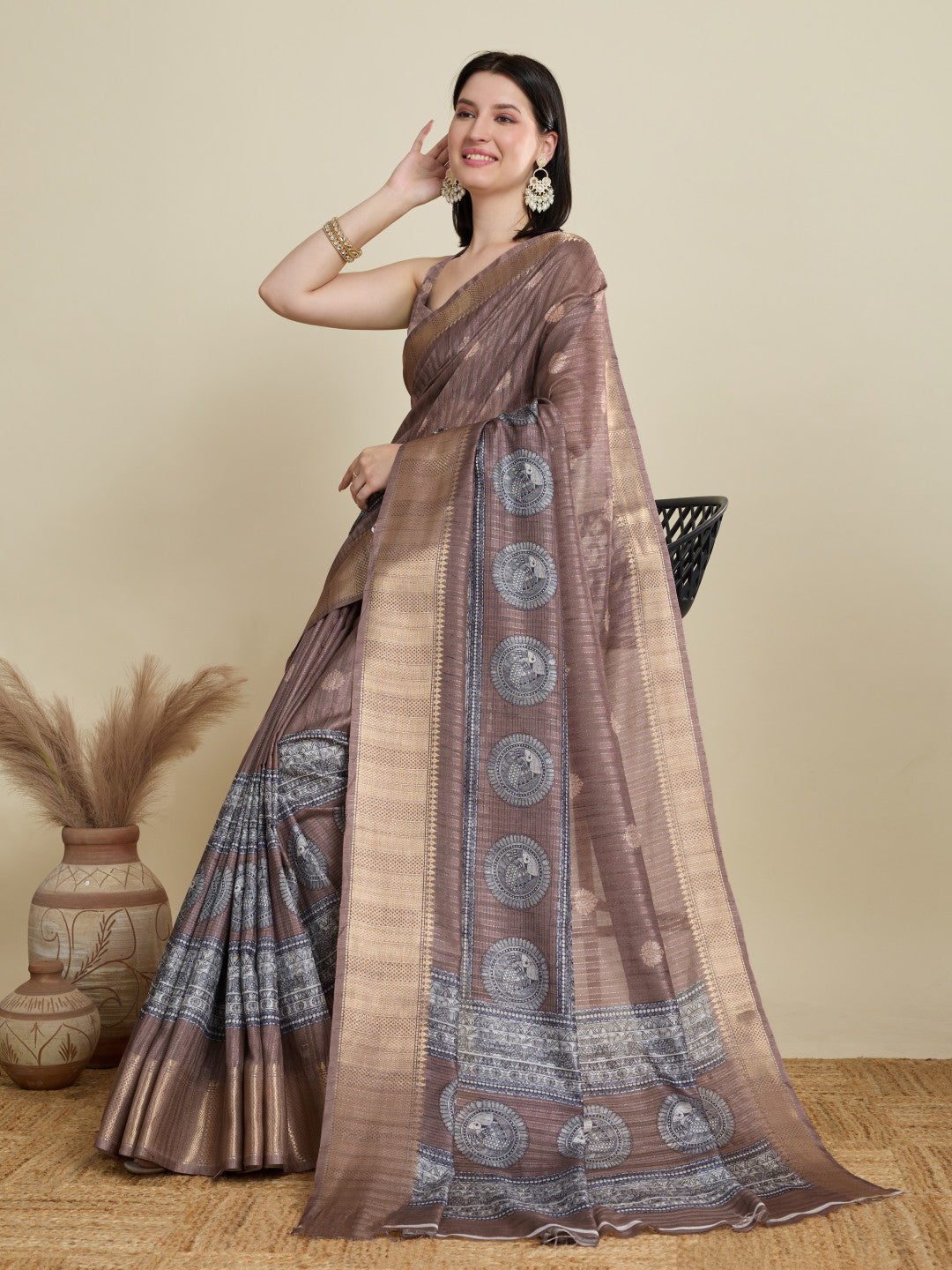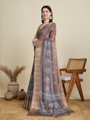 Coffee Soft Cotton Saree With Kalamkari Digital Printed Pallu & Zari Border