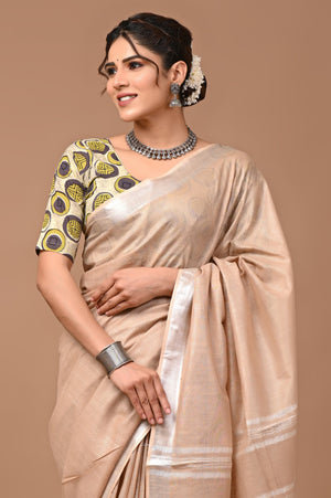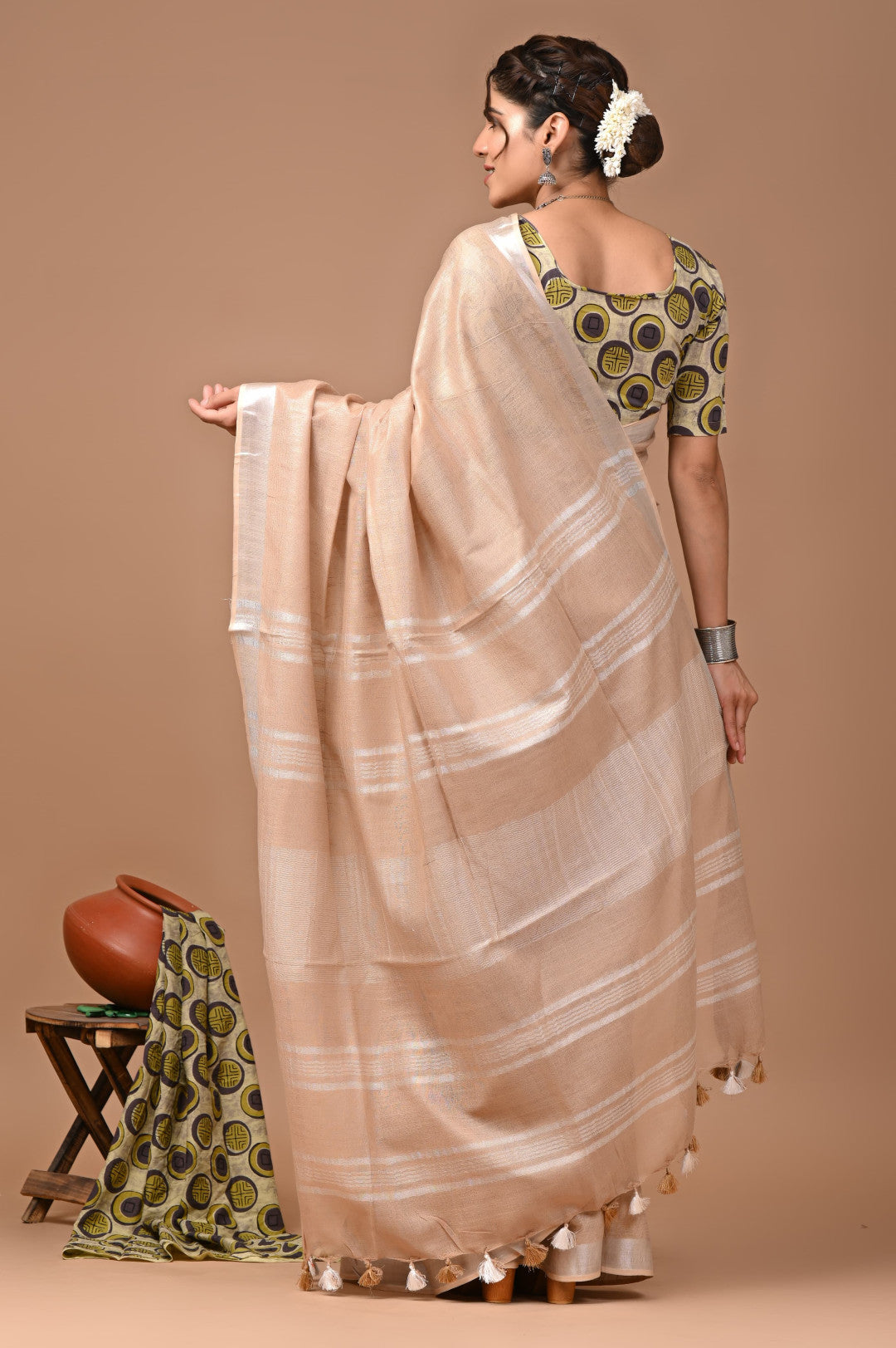 Cream Colour Pure Plain Linen Cotton Saree With Ajrakh Blockprinted Cotton Blouse