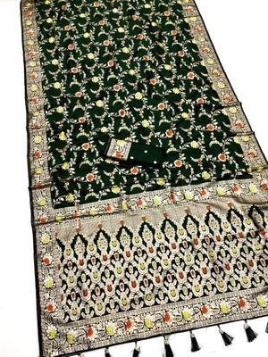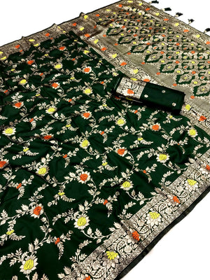Dark Green Banarasi Silk Saree With Meenakari Zari Weaving Work