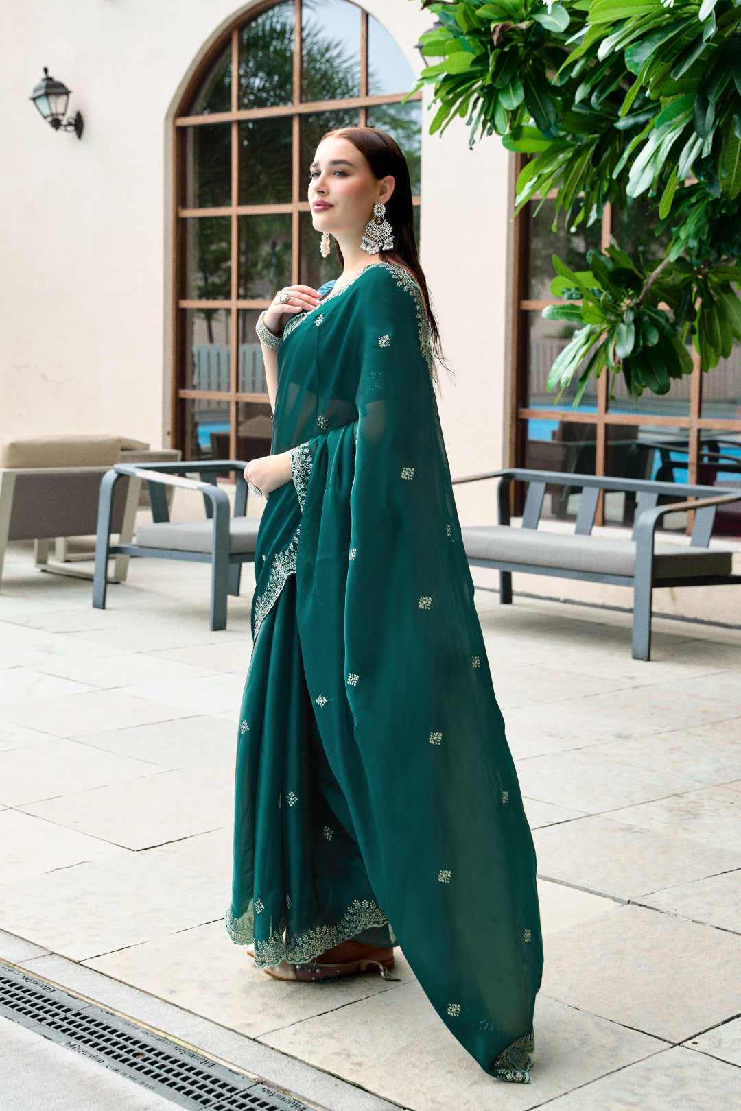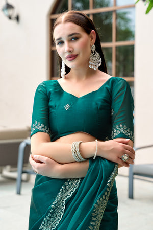 Dark Green Fancy Shimmer Chiffon Saree With Embroidery Work