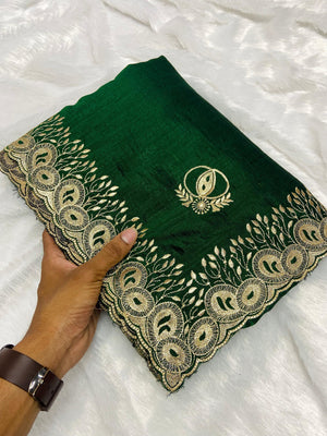 Fancy Green Color Vichitra Silk Saree With Beautiful Cutwork & Embroidery Border