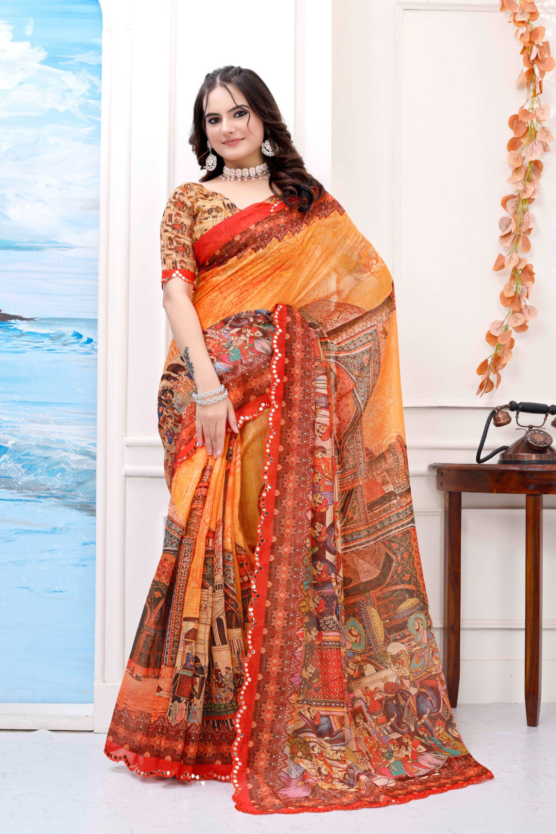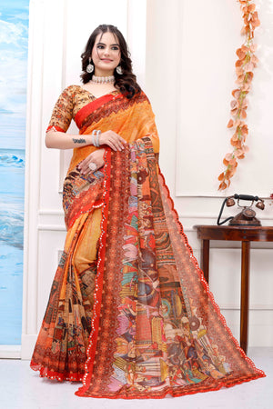 Fancy Multi Kalamkari Printed Chanderi Cotton Saree With Mirror Cutwork Border