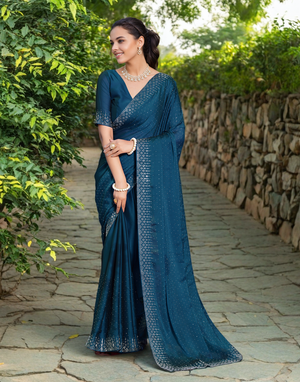 Fancy Teal Blue Rangoli Silk Saree With Diamond Work
