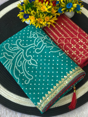 Firoji Color Georgette Bandhani Saree With Foil Print Work