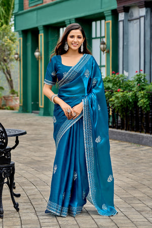 Firoji Fancy Shimmer Chiffon Saree With Embroidery Work