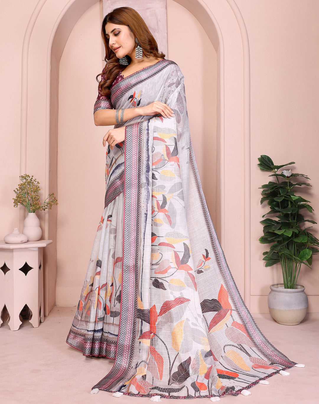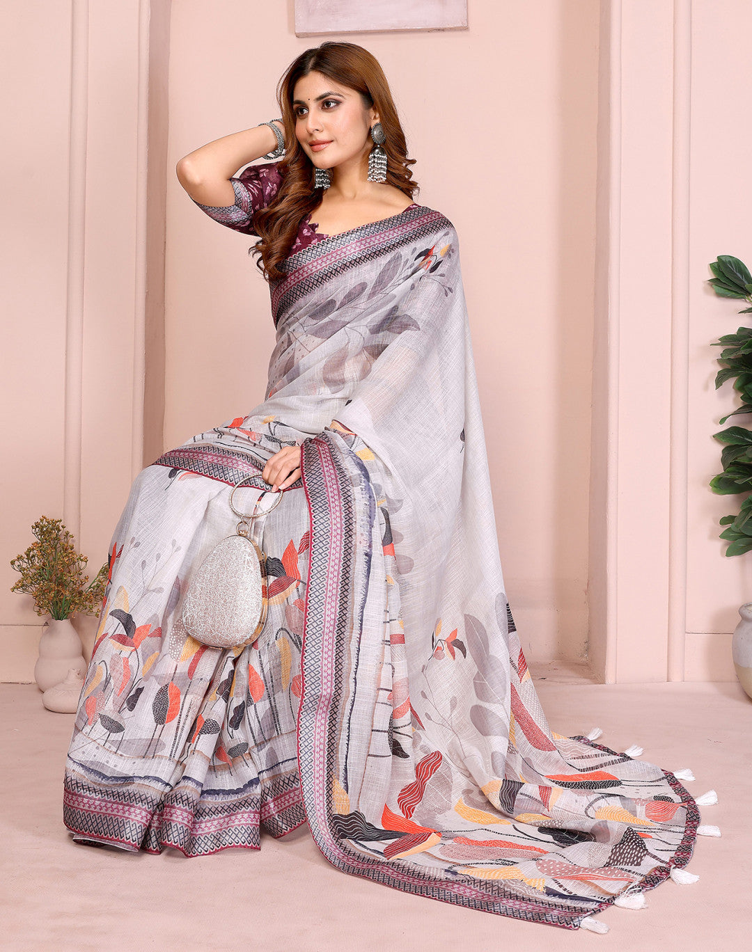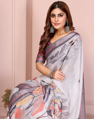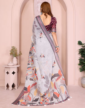 Gray Linen Cotton Saree With Digital Printed Work And Silver Zari Border