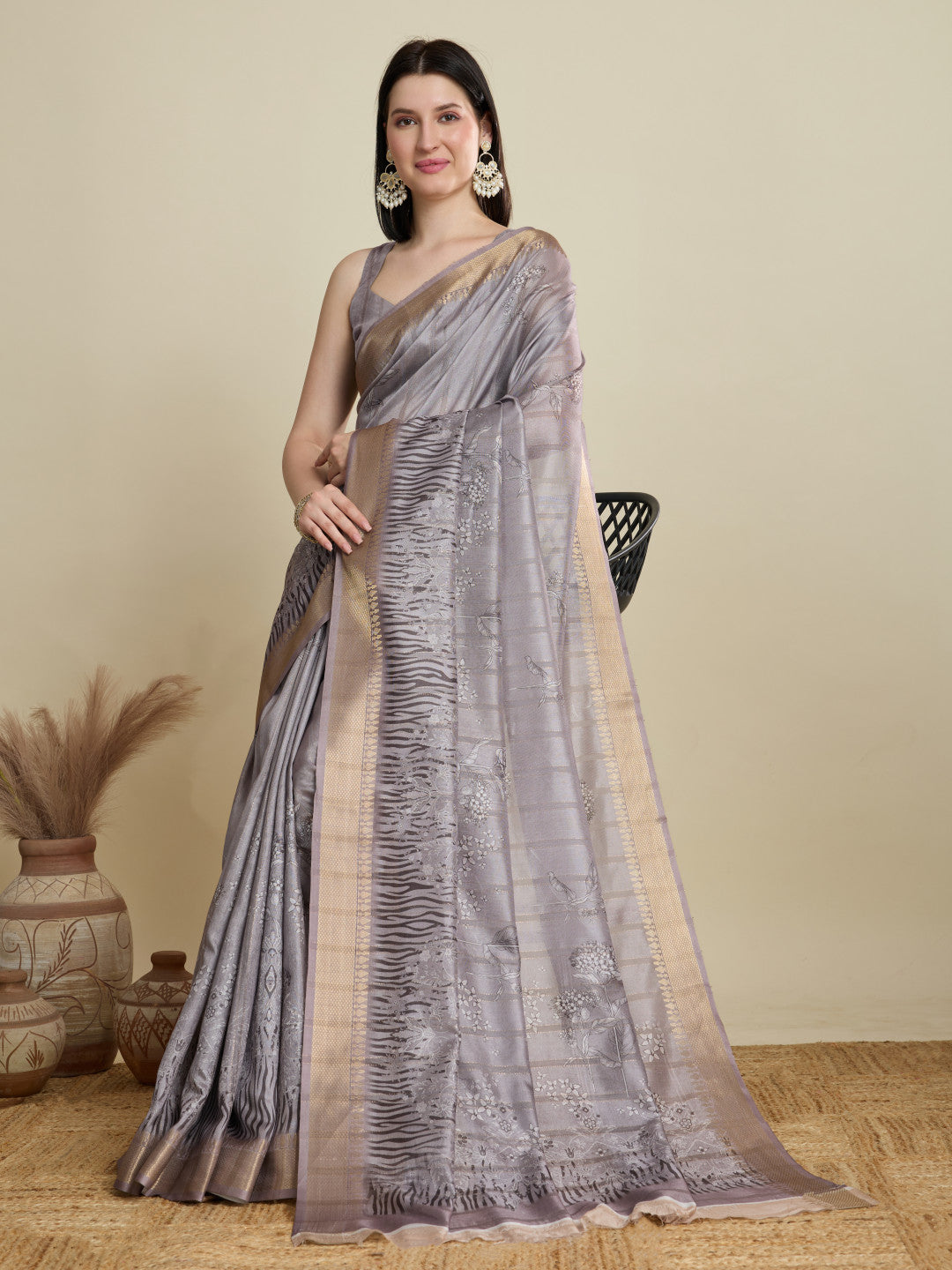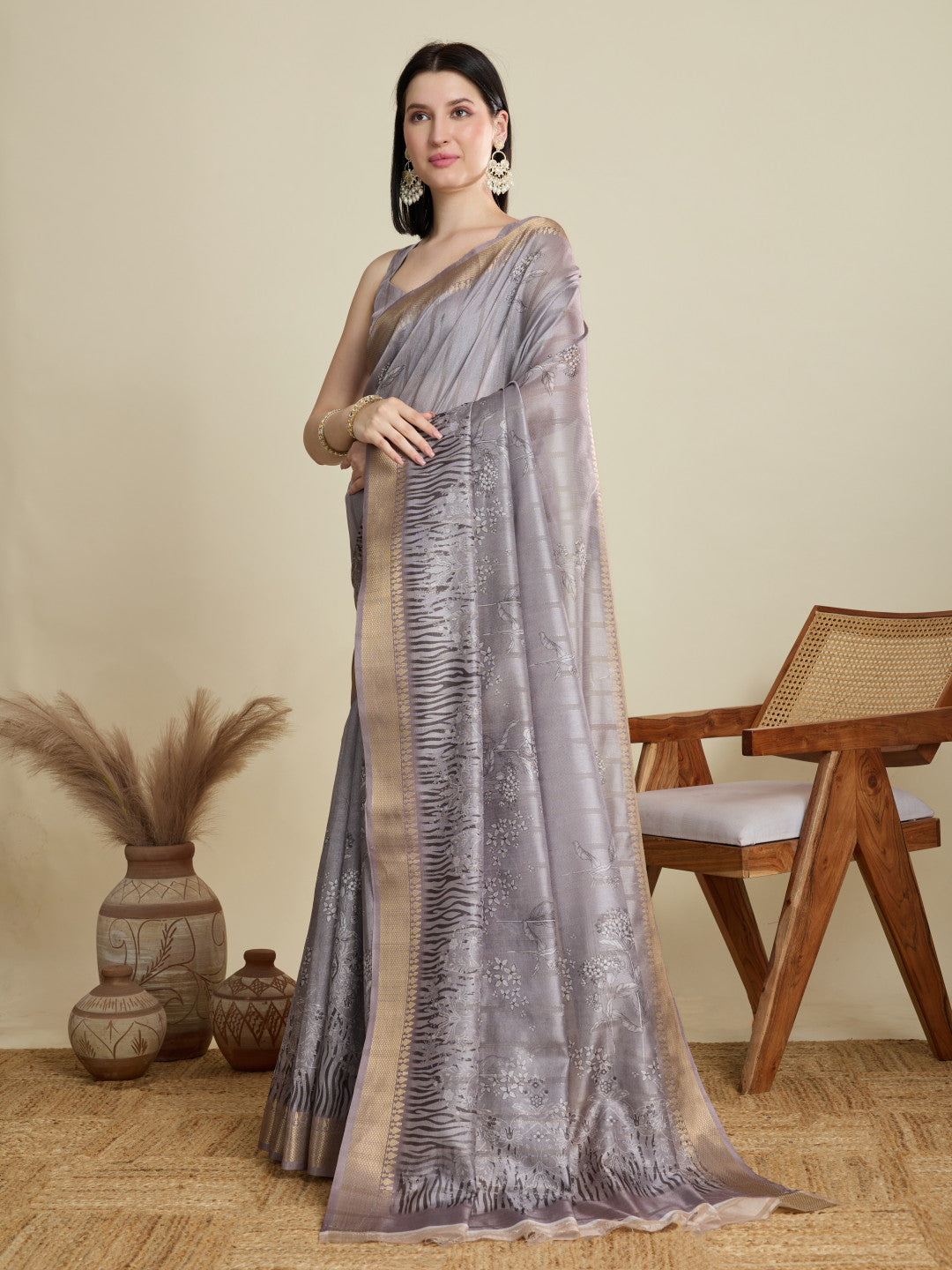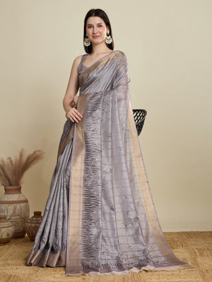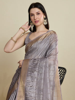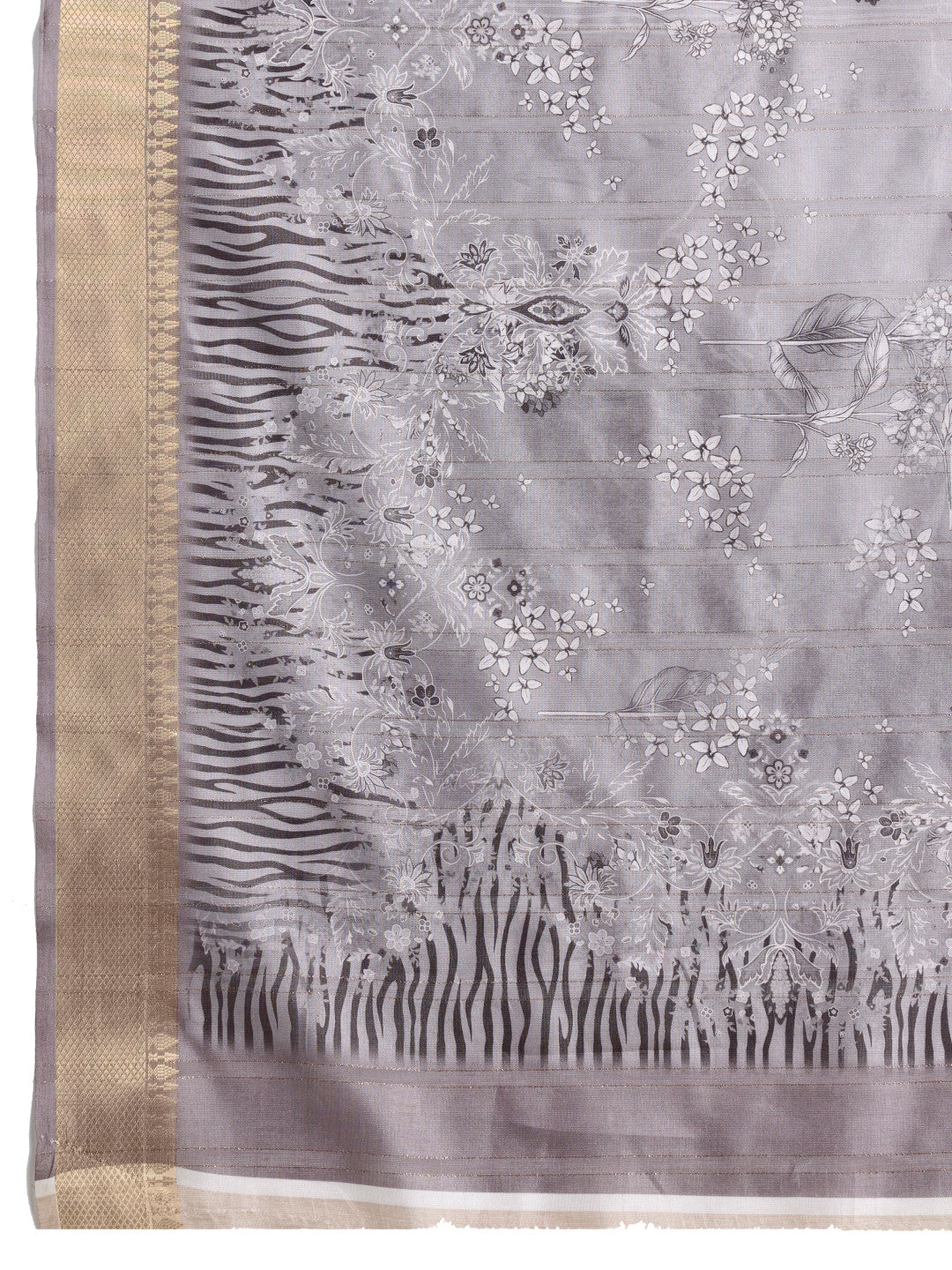 Gray Soft Cotton Saree With Digital Printed Pallu & Zari Border