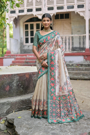 Green Color Soft Tussar Silk Saree With Patola Printed Work