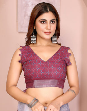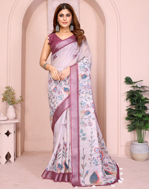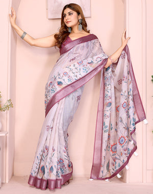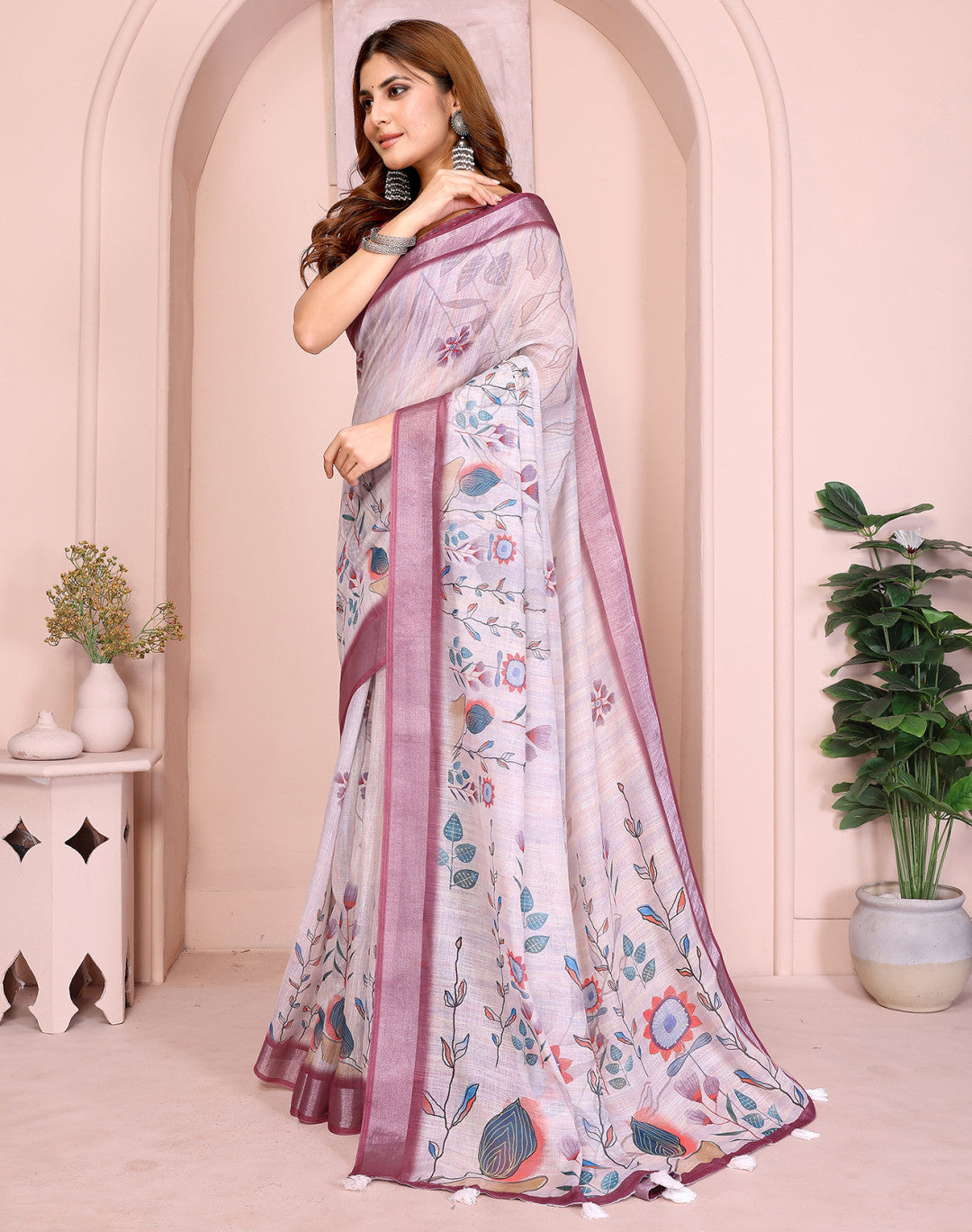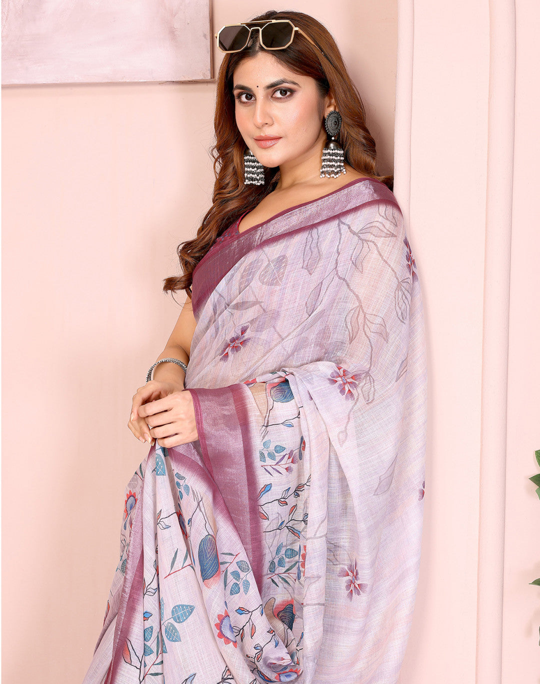 Lavender Linen Cotton Saree With Digital Printed Work And Silver Zari Border