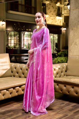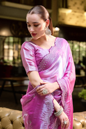 Light Pink Fancy Shimmer Chiffon Saree With Embroidery Work