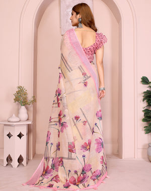 Light Yellow Linen Cotton Saree With Digital Printed Work And Silver Zari Border