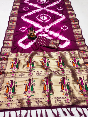Magenta Color Soft Dola Silk Saree With Shibori Print & Zari Weaving Work