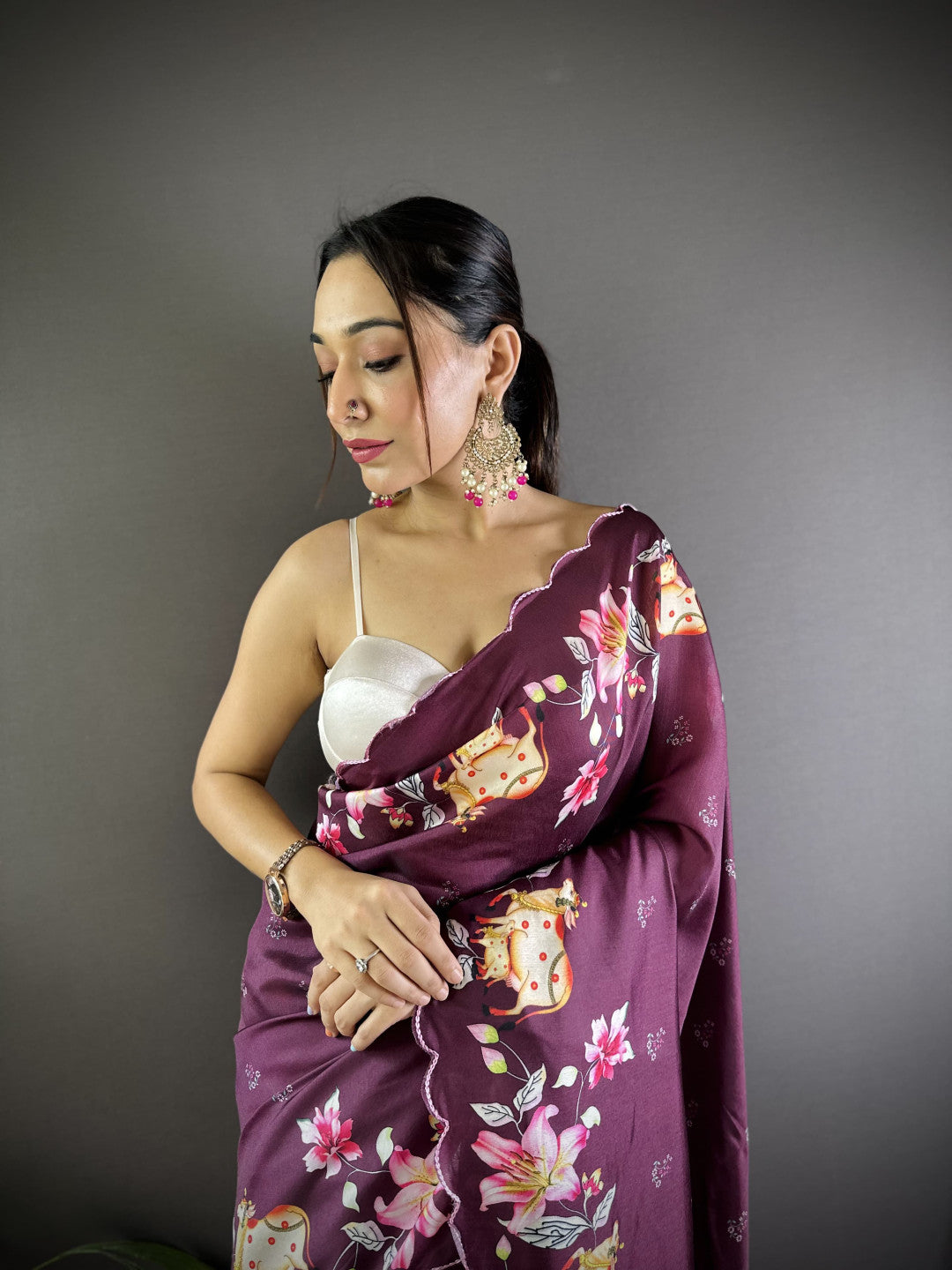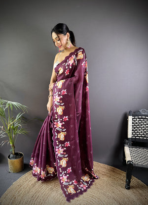 Magenta Gadhwal Silk Saree With Pichwai Print And Embroidery Cut Work