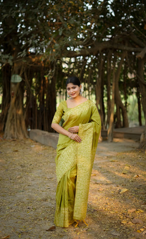Mahendi Green Handloom Raw Silk Saree With Contrast Weaving Work