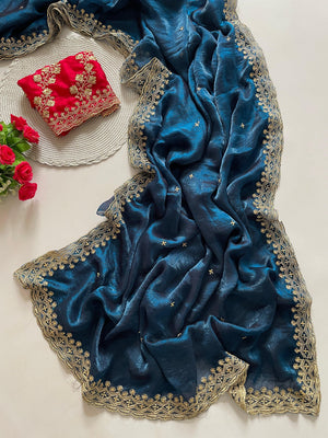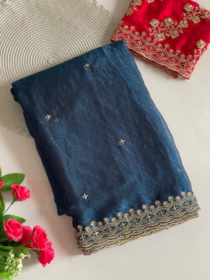 Morpeach Fancy Space Silk Saree With Embroidery & Moti Work