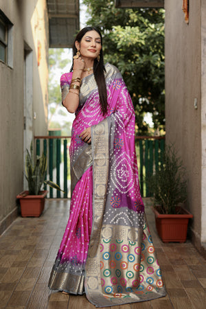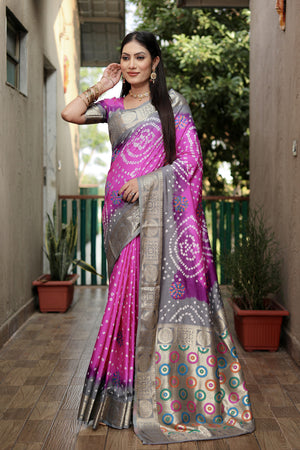 Multi Color Soft Bandhej Silk Saree With Zari Weaving Work