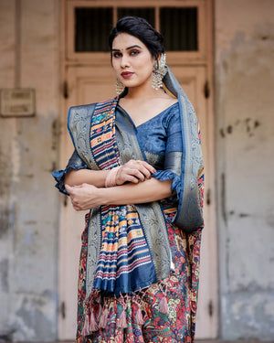 Multi Digital Kalamkari Printed Tussar Silk Saree With Zari Motif Border