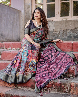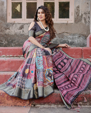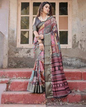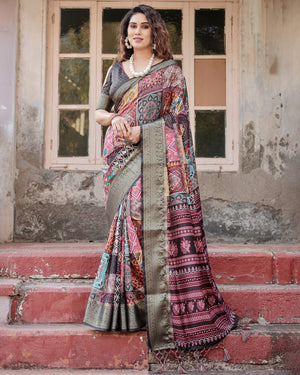Multi Digital Kalamkari Printed Tussar Silk Saree With Zari Motif Border