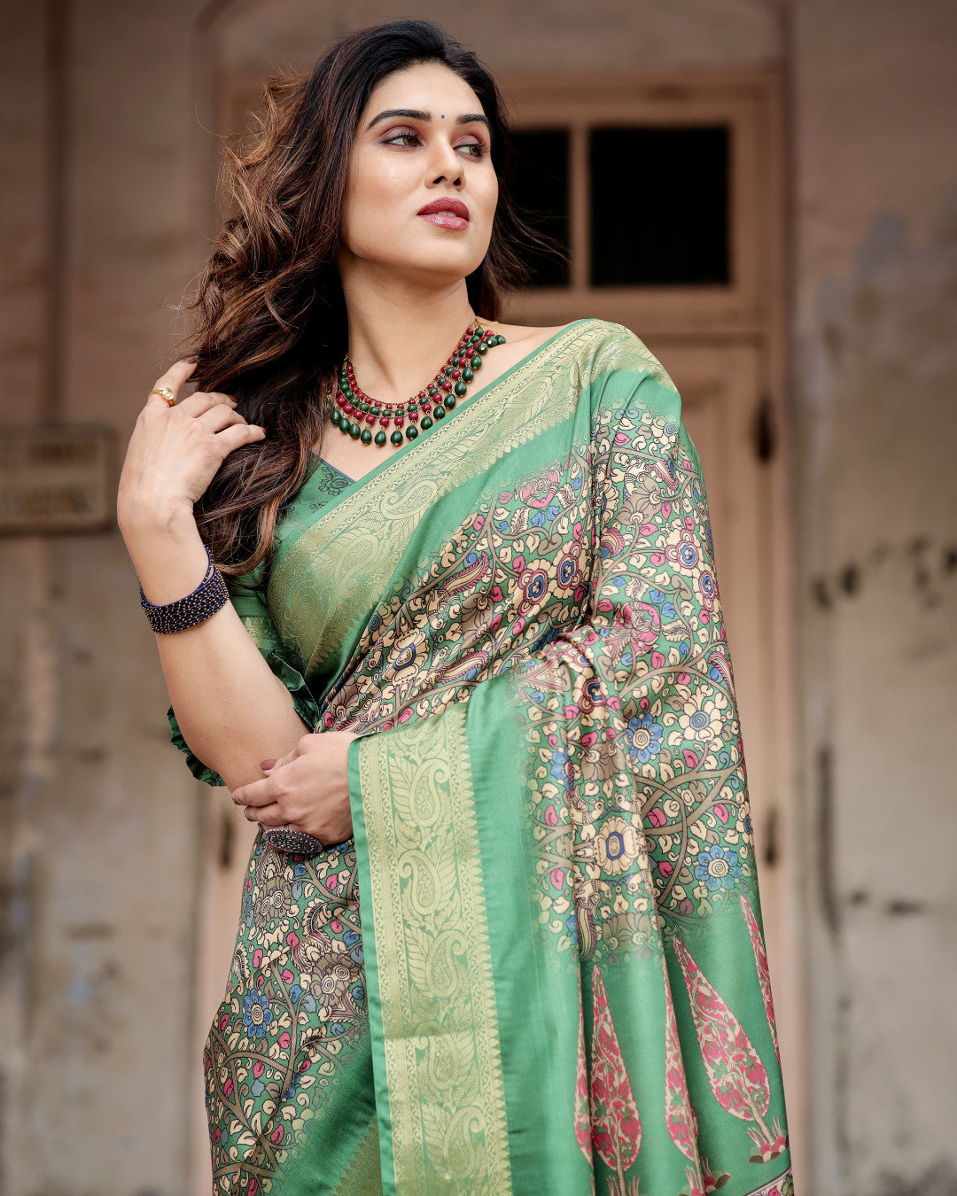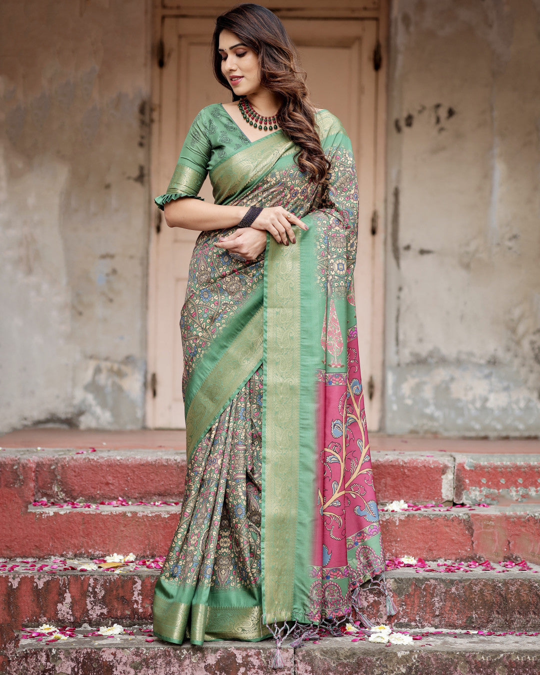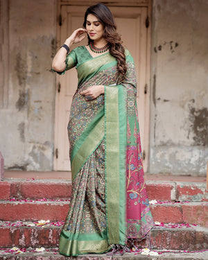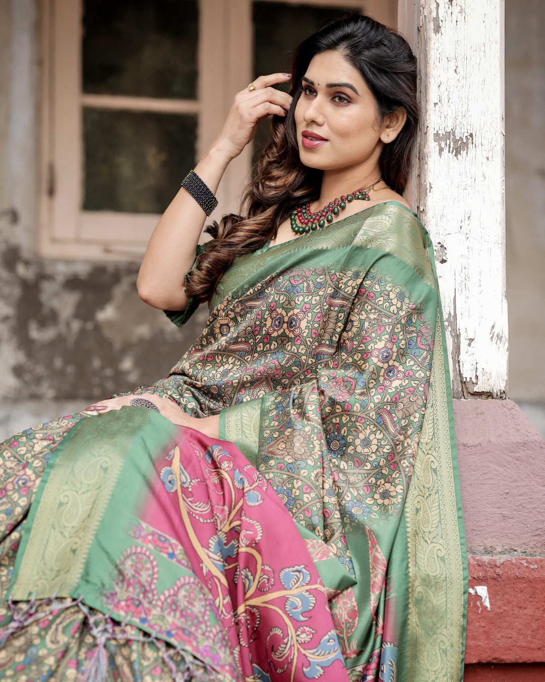 Multi Kalamkari Digital Printed Dola Silk Saree With Gold Zari Border