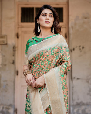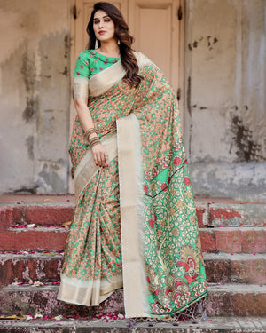 Multi Kalamkari Digital Printed Dola Silk Saree With Gold Zari Border