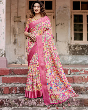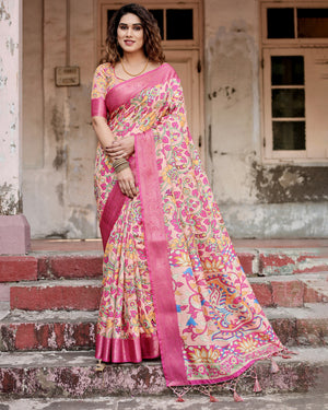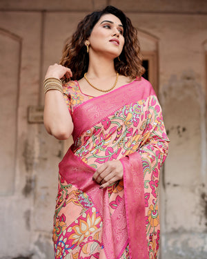 Multi Kalamkari Digital Printed Dola Silk Saree With Gold Zari Border