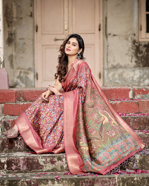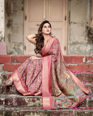 Multi Kalamkari Digital Printed Dola Silk Saree With Gold Zari Border