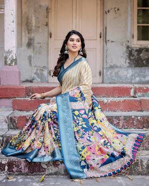 Multi Kalamkari Digital Printed Tussar Silk Saree With Zari Motif Border