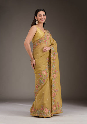 Mustard Yellow Fancy Crunchy Silk Saree With Multi Thread Work And Piping Lace Border