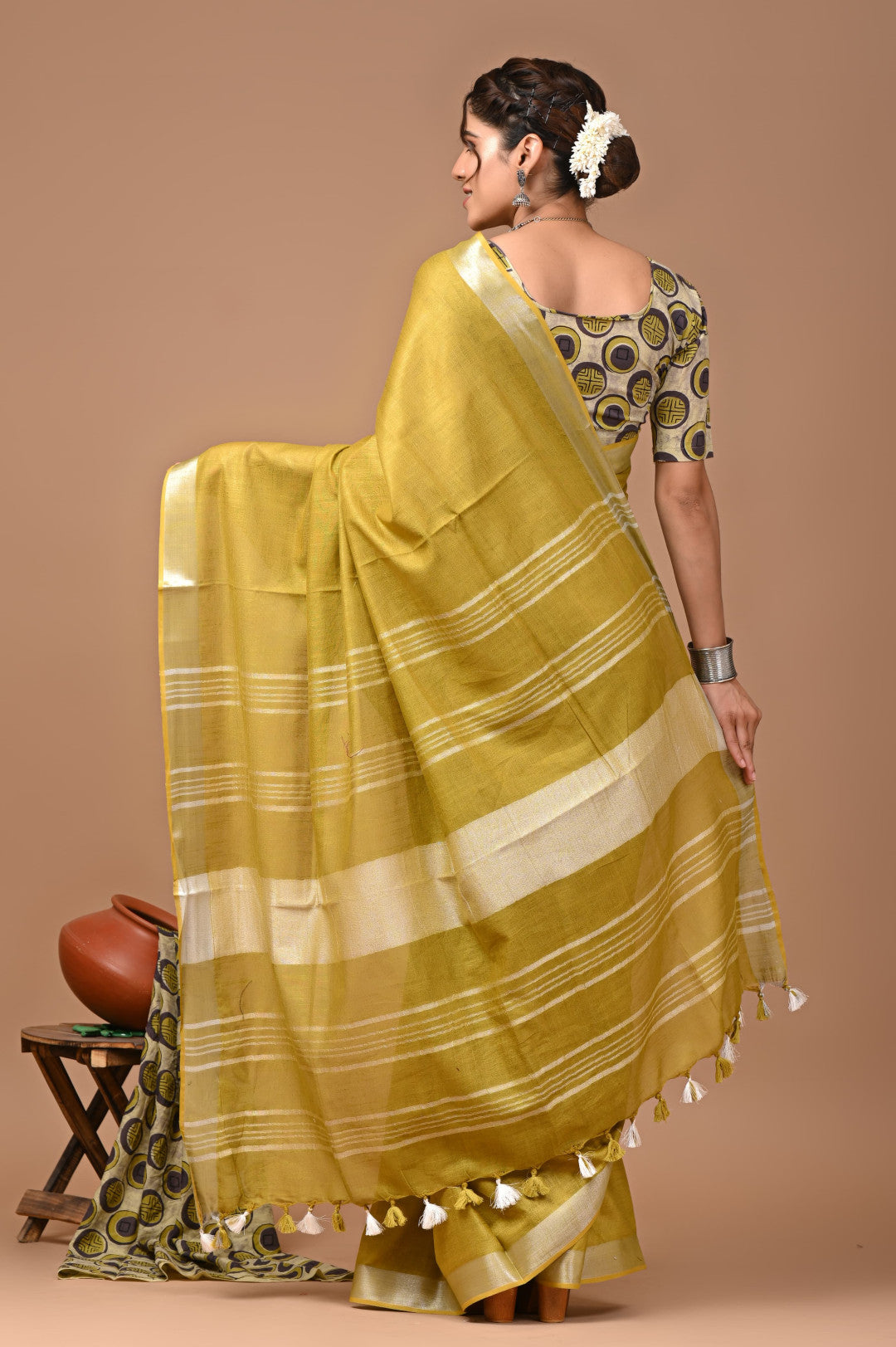 Mustrad Yellow Colour Pure Plain Linen Cotton Saree With Ajrakh Blockprinted Cotton Blouse