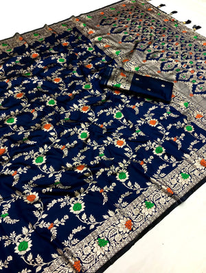 Navy Blue Banarasi Silk Saree With Meenakari Zari Weaving Work