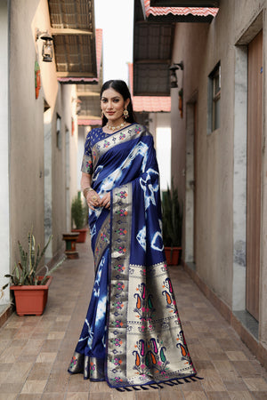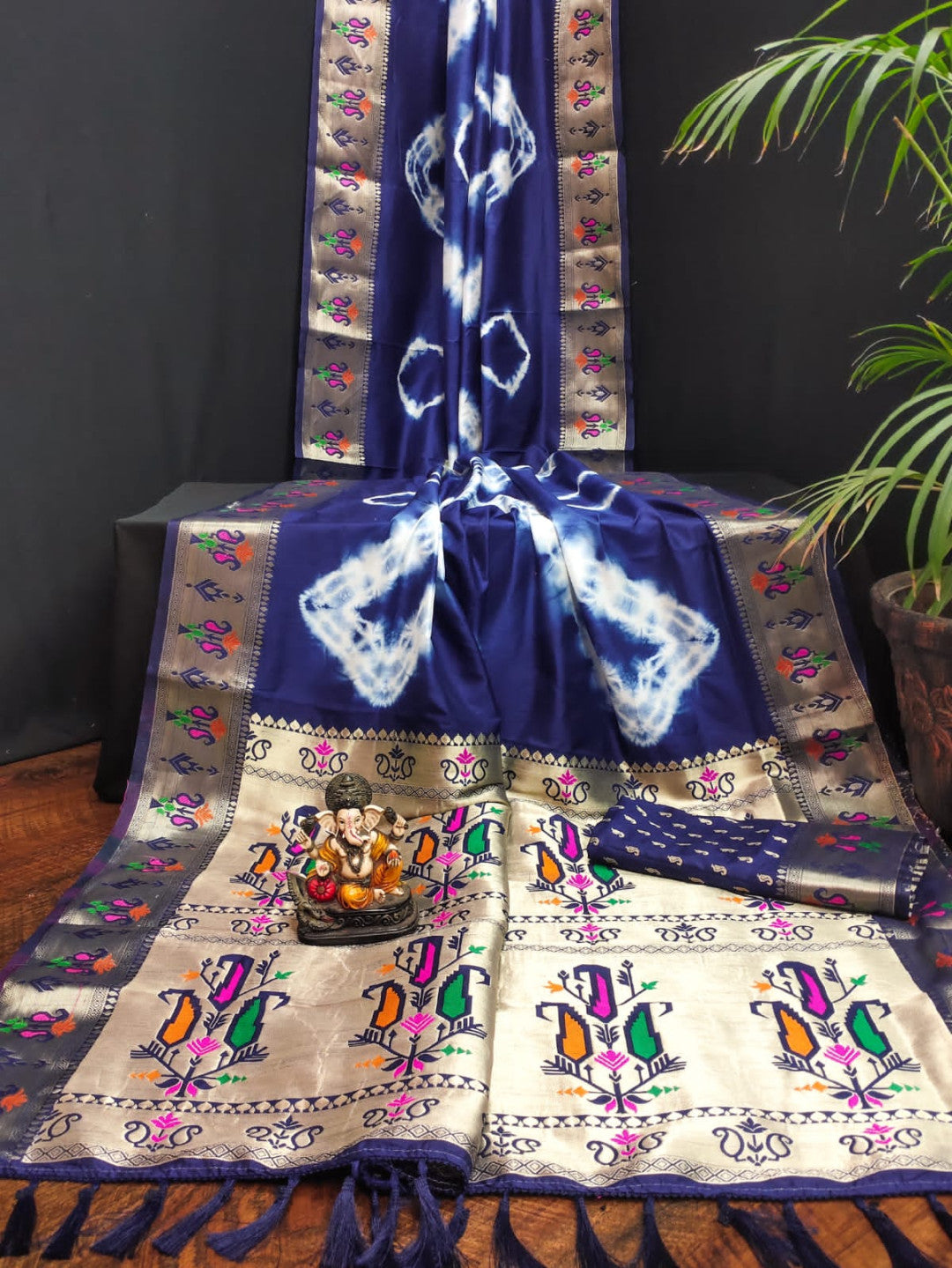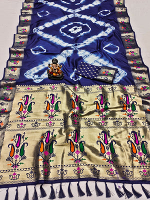 Navy Blue Color Soft Dola Silk Saree With Shibori Print & Zari Weaving Work