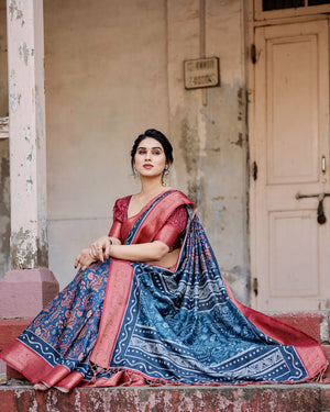 Navy Blue Digital Kalamkari Printed Tussar Silk Saree With Zari Motif Border