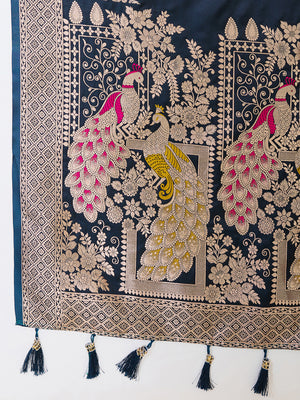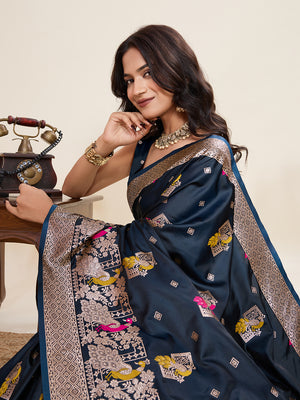 Navy Blue Soft Satin Silk Saree With Zari Weaving Work And Paithani Pallu