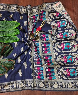 Navy Blue Traditional Handloom Raw Silk Saree With Woven Design