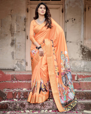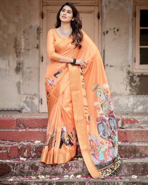 Orange Kalamkari Digital Printed Dola Silk Saree With Gold Zari Border