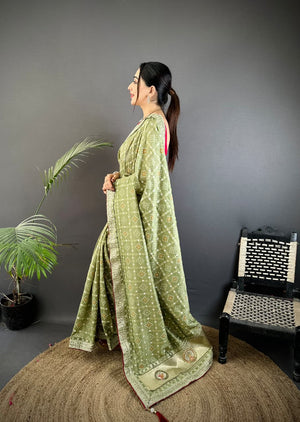 Parrot Green Traditional Blooming Vichitra Khadi Bandhej Silk Saree With Sequence Work