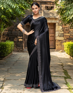 Party Wear Black Satin Silk Fancy Saree With Siroski Work