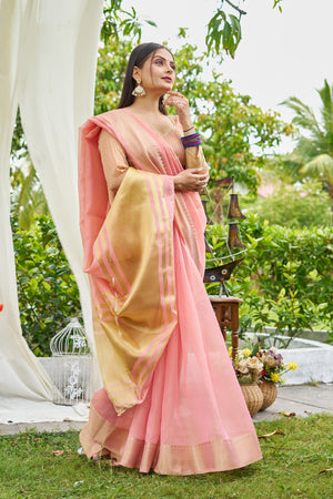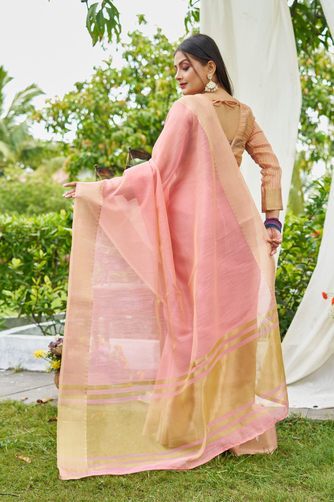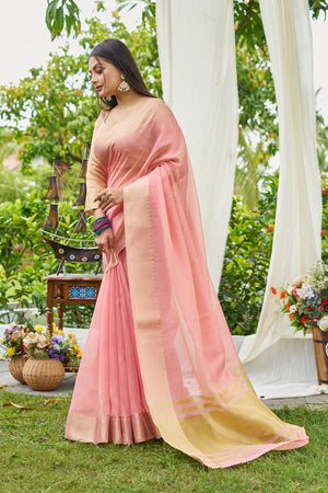 Pink Color Linen Cotton Saree With Zari Weaving Border