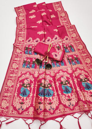 Pink Traditional Handloom Raw Silk Saree With Woven Design