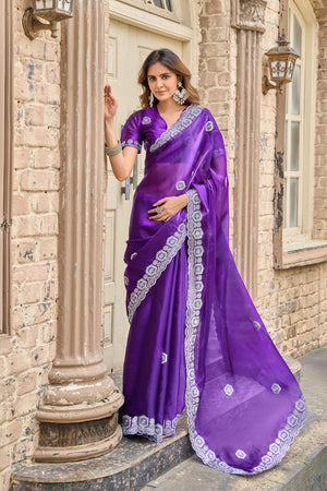 Purple Fancy Shimmer Chiffon Saree With Embroidery Work