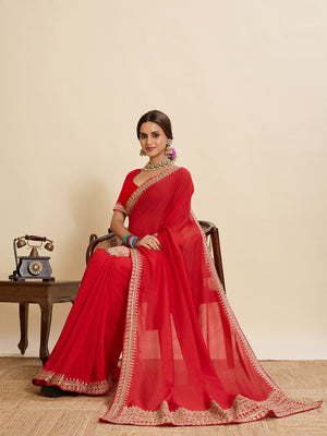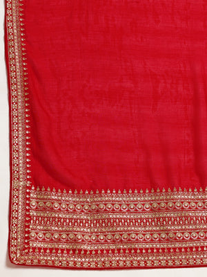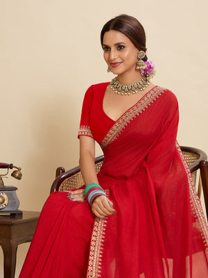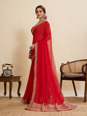 Red Soft Vichitra Silk Saree With Embroidery Work